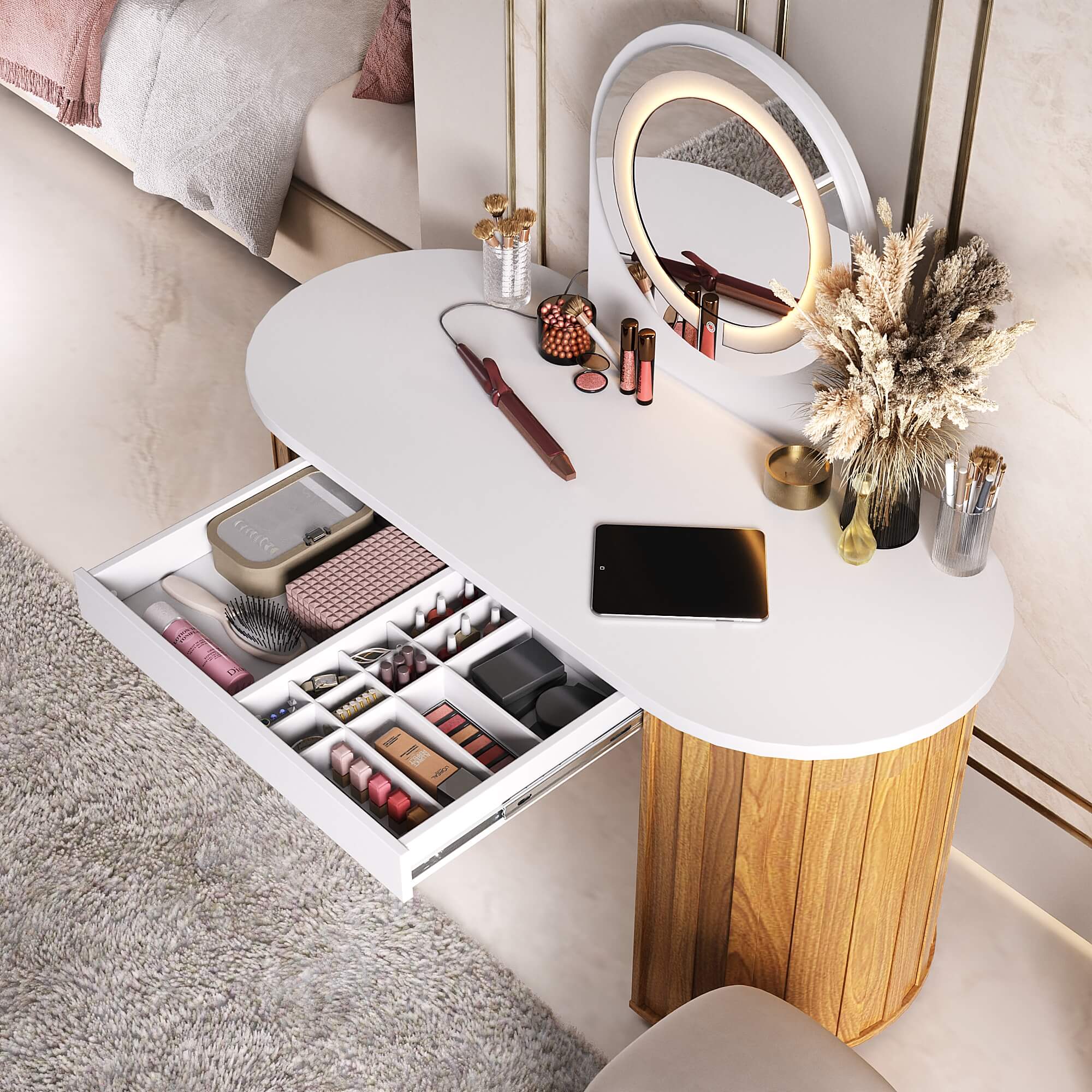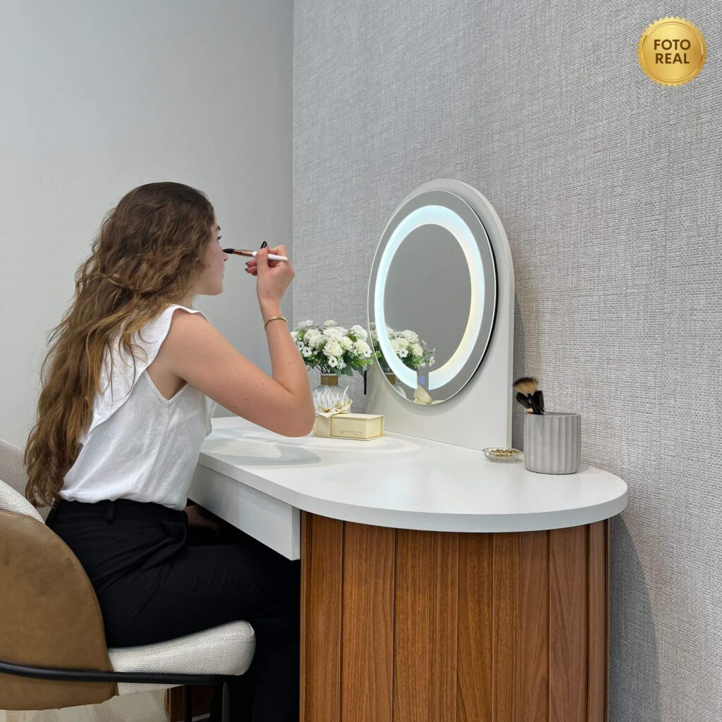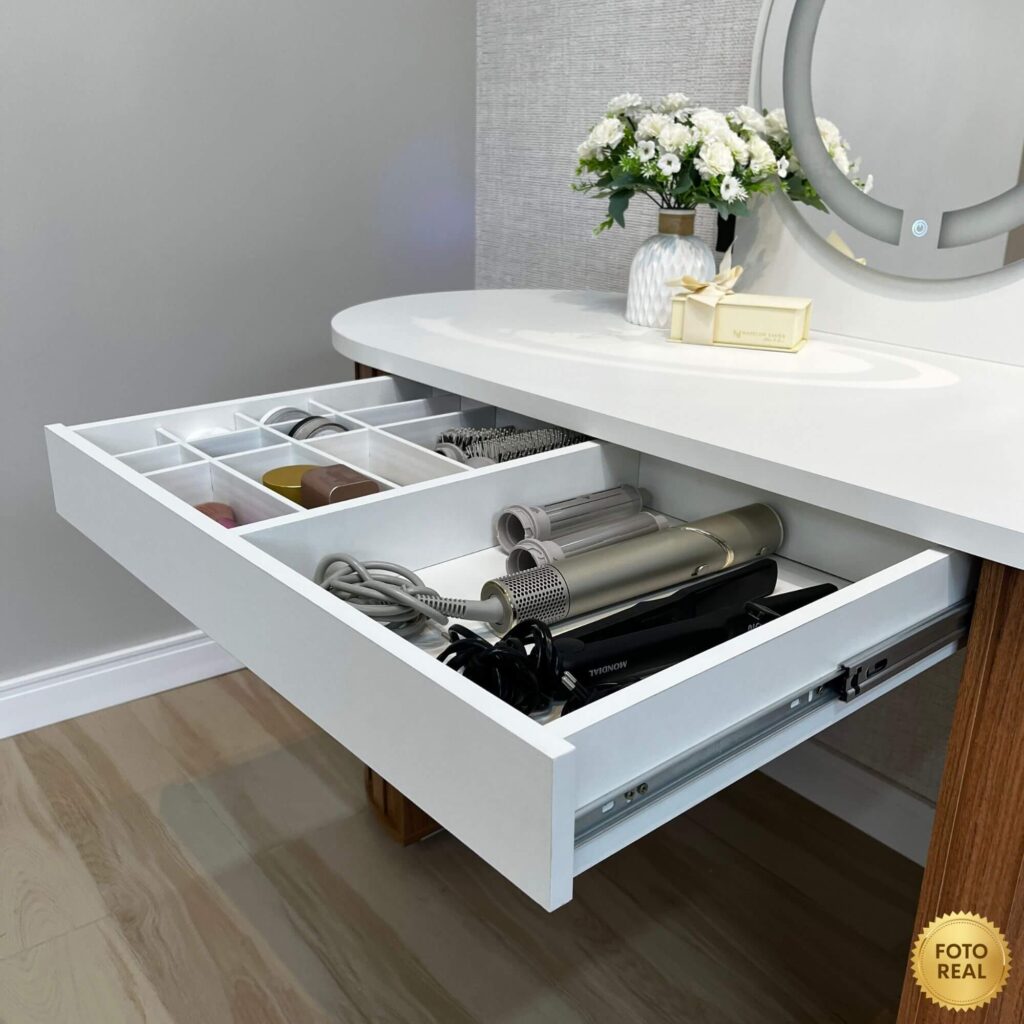 Pensada para espaços que não abrem mão da elegância, a Glamour transforma o ato de se cuidar, trabalhar ou criar em um momento especial. Cada detalhe foi projetado para entregar funcionalidade com requinte, resultando em um móvel que se destaca, valoriza o ambiente e traduz um estilo de vida contemporâneo, feminino e exclusivo.